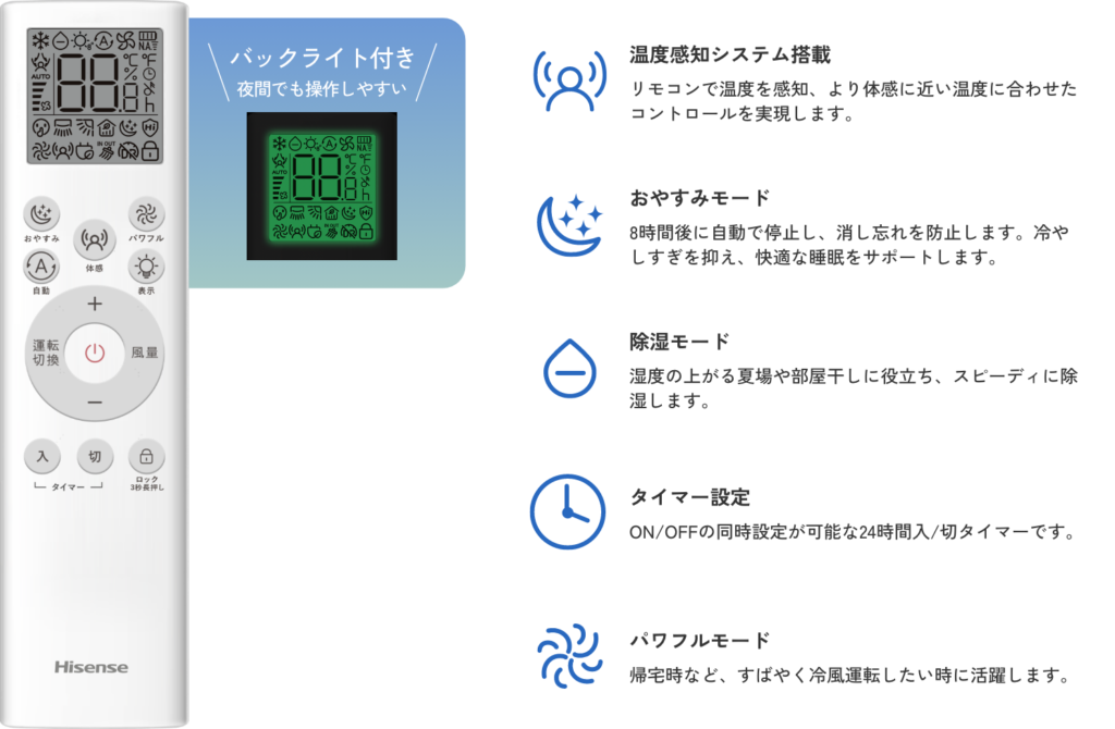 付属のバックライト付きリモコンは、夜間の暗い部屋でも操作しやすく、さらに「体感温度センサー」が内蔵されています。