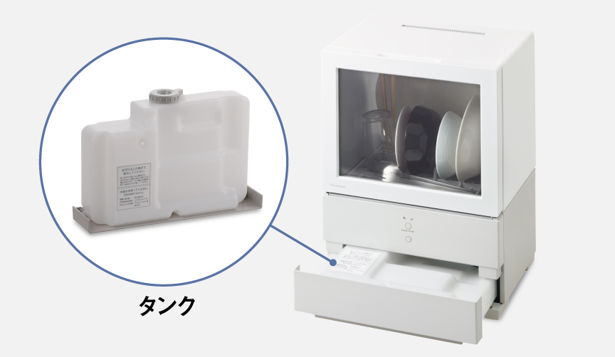 A4サイズほどのコンパクト設計ながら、1人分の食器(約6点)をしっかり洗浄でき、工事不要のタンク式で設置も簡単。