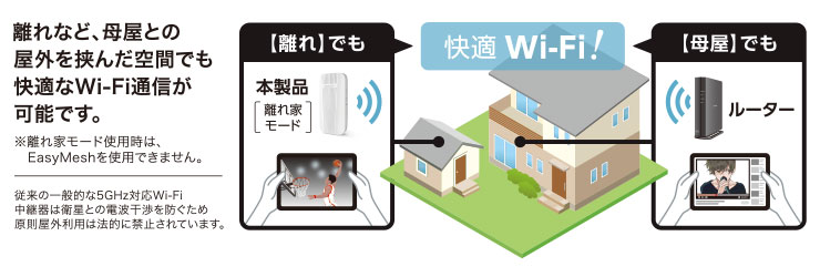 そこを解決したのがエレコム独自の「離れ家モード2」です! これは、屋外利用が認められている特定の電波(W56帯域)だけを使って通信するモード。これを使えば、離れ家やベランダ、玄関先にある防犯カメラなどとも、法律を気にせず堂々と、しかも安定して通信ができるんです。